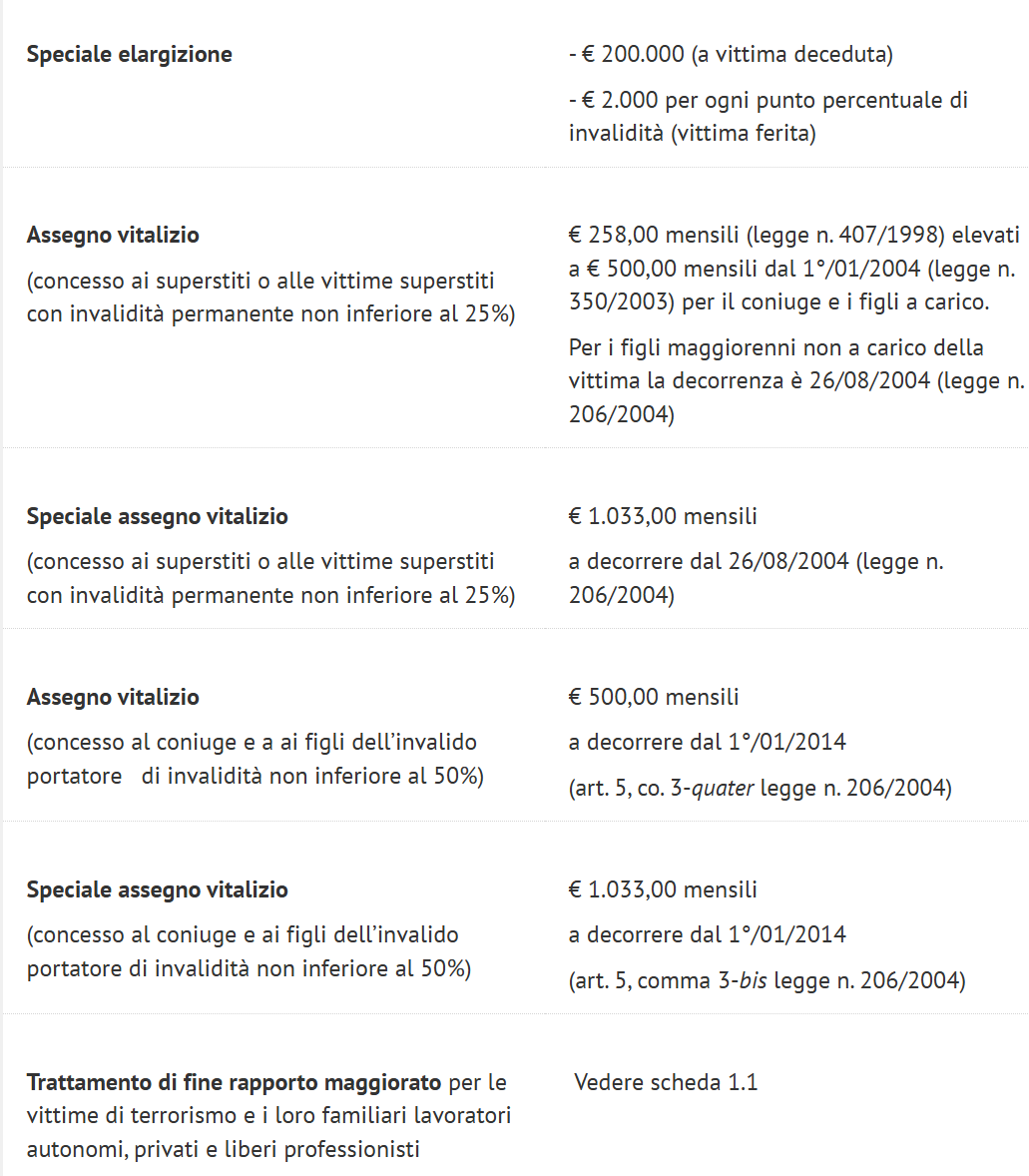 I benefici economici per le vittime civili del terrorismo concessi dall’Ufficio 1, qualora ricorrano i requisiti previsti dalla normativa in vigore, si possono così, sinteticamente, riepilogare: