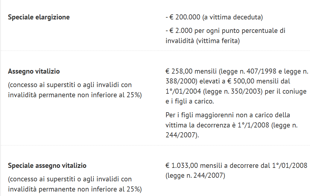 Con le leggi 29 novembre 2007, n. 222 e 24 dicembre 2007, n. 244 taluni benefici economici, già previsti per le vittime del terrorismo dalla legge n. 206/2004 recante "Nuove norme in favore delle vittime del terrorismo e delle stragi di tali matrici", quali l’elevazione della speciale elargizione alla misura massima di € 200.000,00 e lo speciale assegno vitalizio di € 1.033,00 sono stati estesi anche alle vittime e ai superstiti della criminalità organizzata, del dovere, nonché ai sindaci vittime di atti criminali nell’esercizio delle loro funzioni.